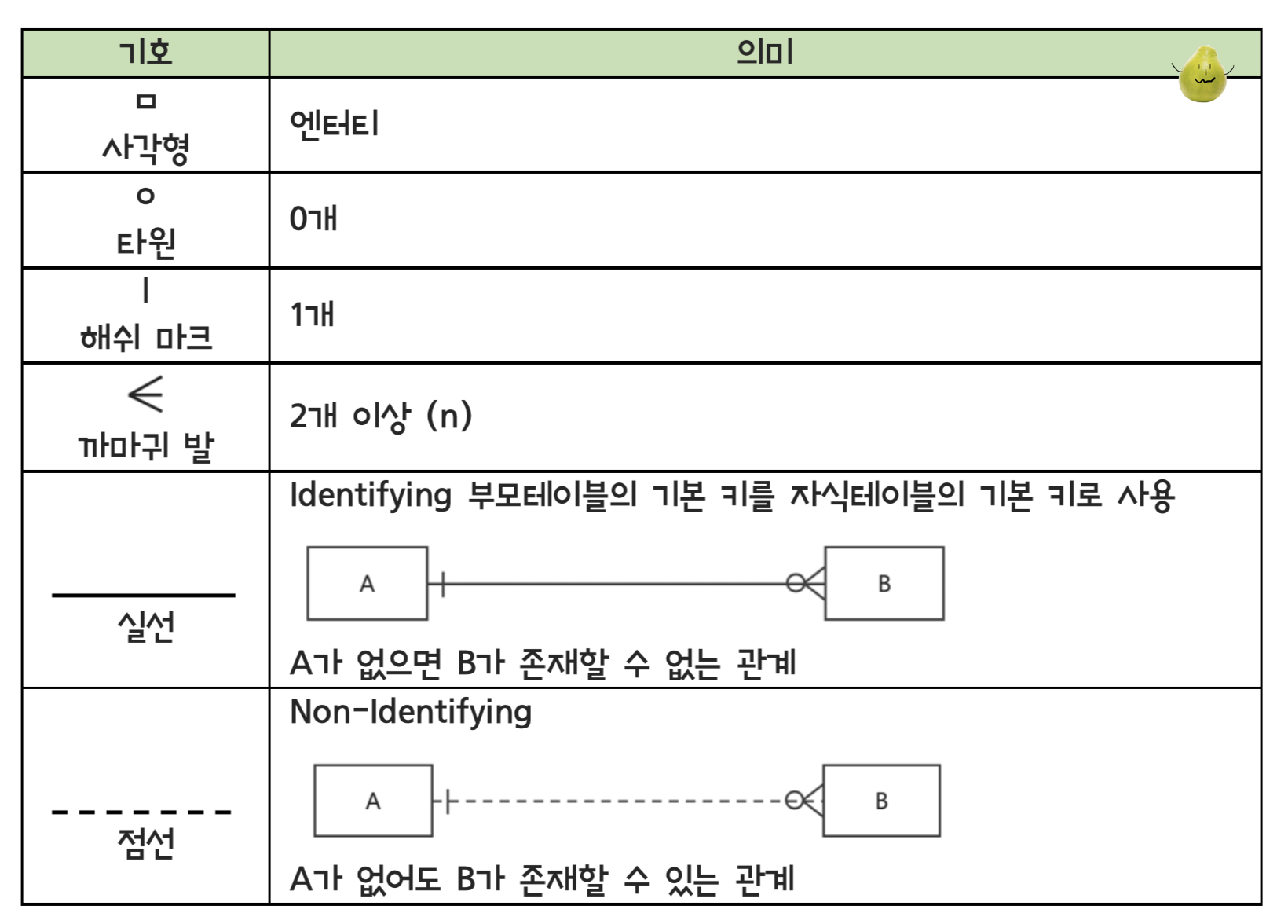 - 주식별자는 반드시 존재해야됨. => 부모 엔터티가 있어야 생성가능하며 단일 식별자인지 복합식별자인지에 따라 1:1이나 1:M이거나가 결정된다.